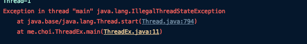 오류가 떨어지는 이유는 새로운 Thread를 생성하지 않고 기존의 Thread를 재호출하였기 때문이다.