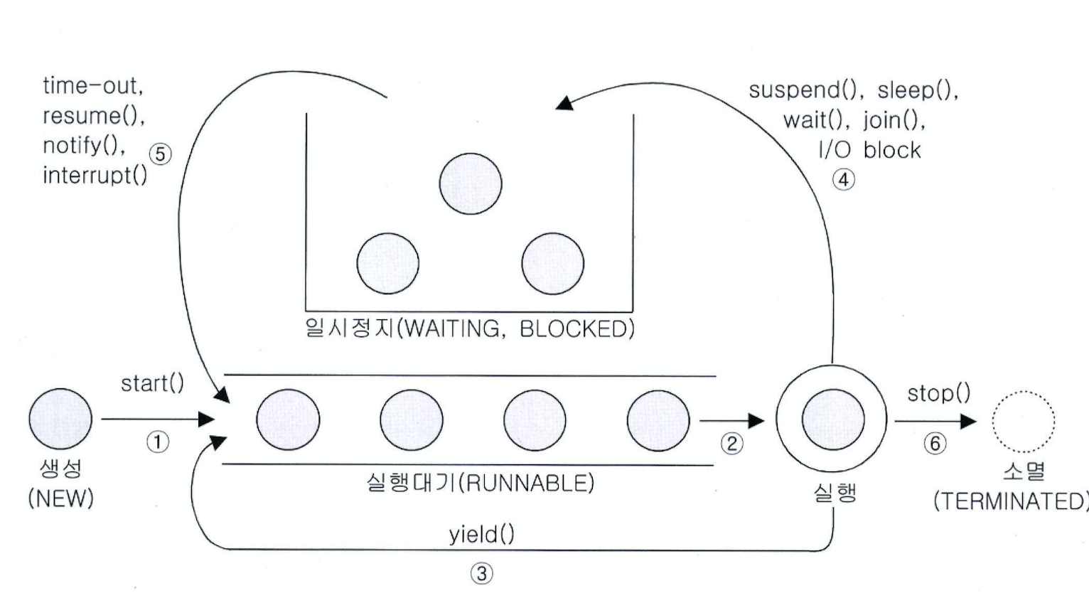 - 주어진 실행상태가 다 되거나 yield()를 만나면 다시 실행 대기상태가 된다.