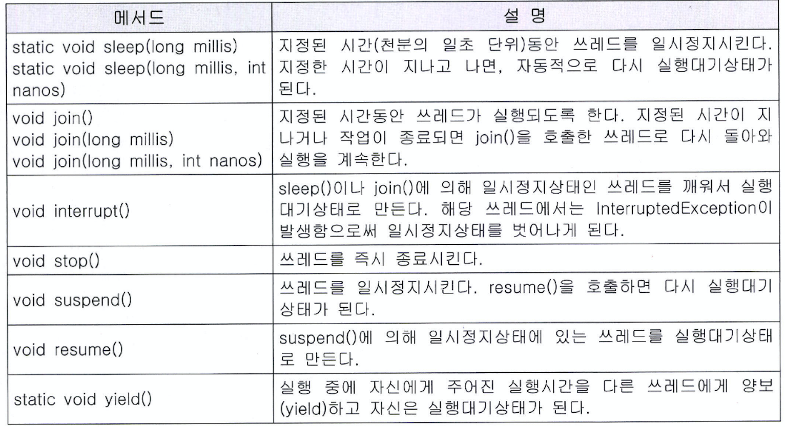 | WAITING, TIMED_WAITING | 쓰레드의 작업이 종료되지는 않지만 실행가능하지 않은 일시정지 상태 |