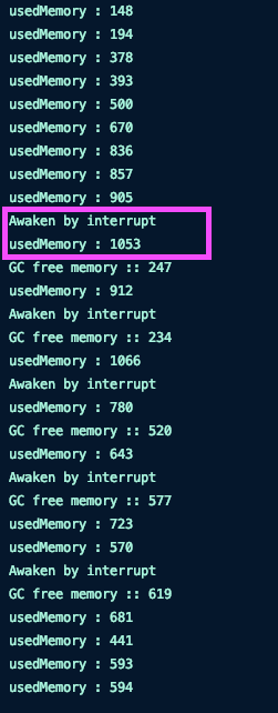 실행결과를 보면 interrupt()를 발생시켰음에도 불구하고 usedMemory 양이 1000이 넘는다.