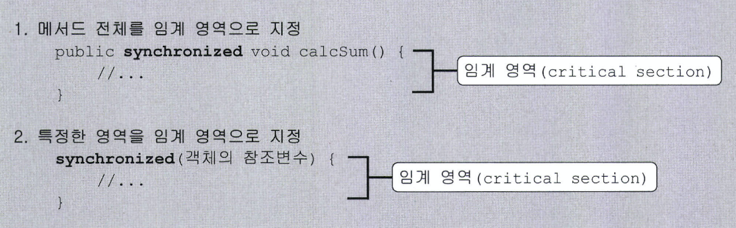 - 공유 데이터를 사용하는 코드의 영역을 임계 영역으로 지정 - 이때 공유 데이터는 객체