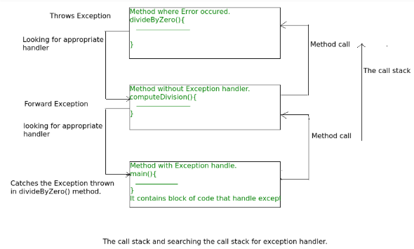 - 런타임 시스템이 exception이 발생한 코드 블록을 포함하는 메서드를 찾기 위해 CallStack을 탐색한다.