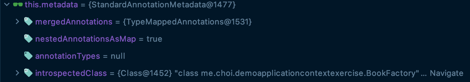 AnnotationMetadata는 인터페이스이다. 해당 클래스 내부에 구현이 완성되어있는 introspect 메서드가 존재한다. 해당 메서드는 하위 클래스인 StandardAnnotationMetadata에게 메시지를 전달한다.