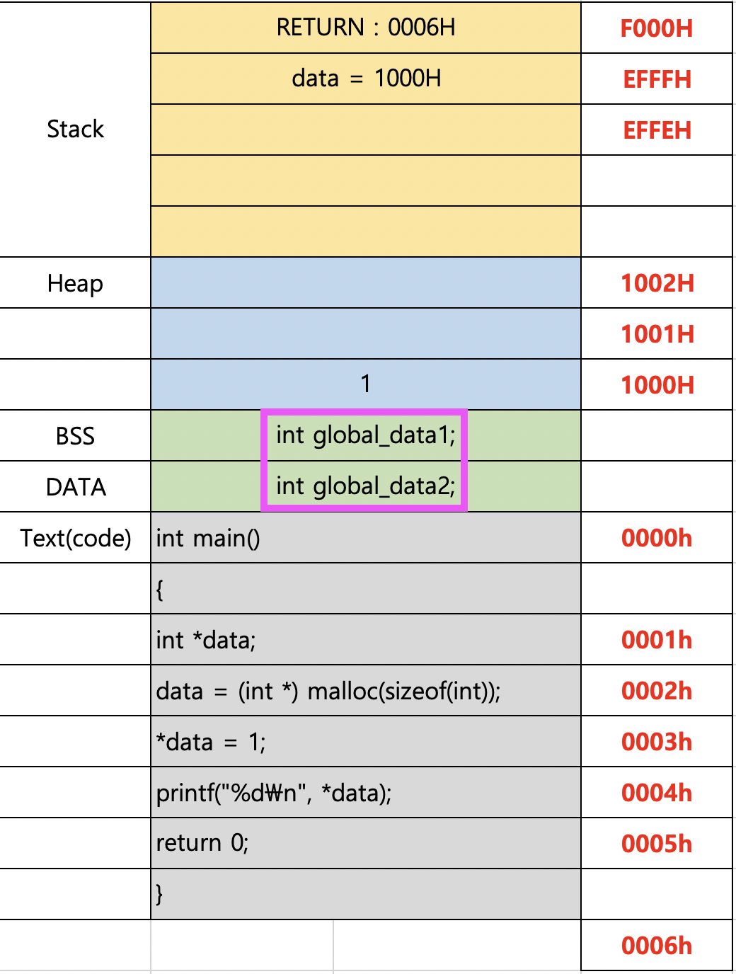 다음 줄은 *data = 1; 로 주소의 값을 초기화하기 때문에 힙의 값을 변경하게 된다.