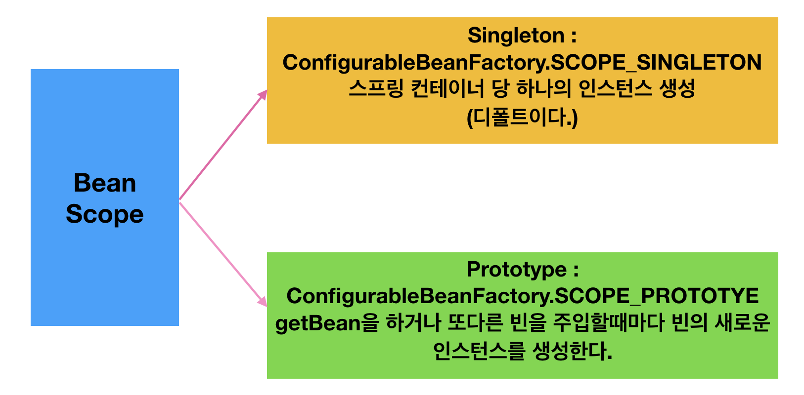 스프링 컨테이너를 통해 빈을 주입받을 때마다 새로운 인스턴스가 생성됨을 의미한다. (context.getbean("..."))