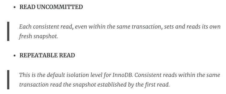 즉 READ UNCOMMITTED 같은 경우에는 SELECT 쿼리로 데이터를 읽어 올 때 테이블에 LOCK을 걸지 않고 해당 시점의 SNAPSHOT을 구축하여 해당 시점에 대한 최신의 데이터를 불러온다.
