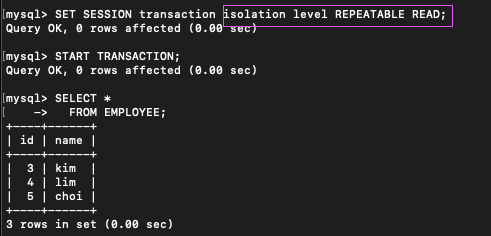 반면에 REPEATABLE READ는 처음에 데이터를 일어올 때의 SNAPSHOT에서 모두 데이터를 불러온다.