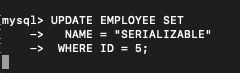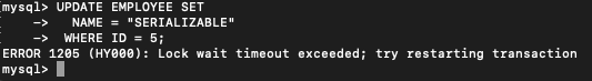 SHARED LOCK이 걸려있으므로 조회는 가능하지만 만약 아래와 같이 UPDATE를 한다면