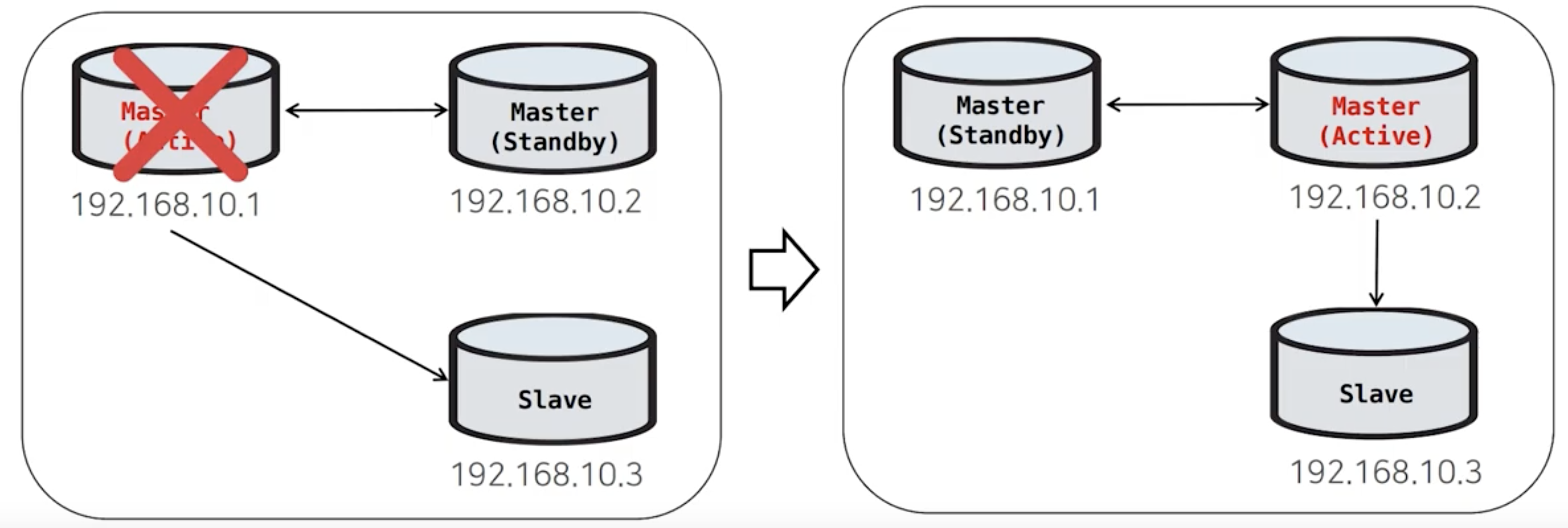 Master(Active)에 장애가 나고 정상적으로 복구가 완료된다면 Master(Standby)로 변경하여 역할만 변경된다.