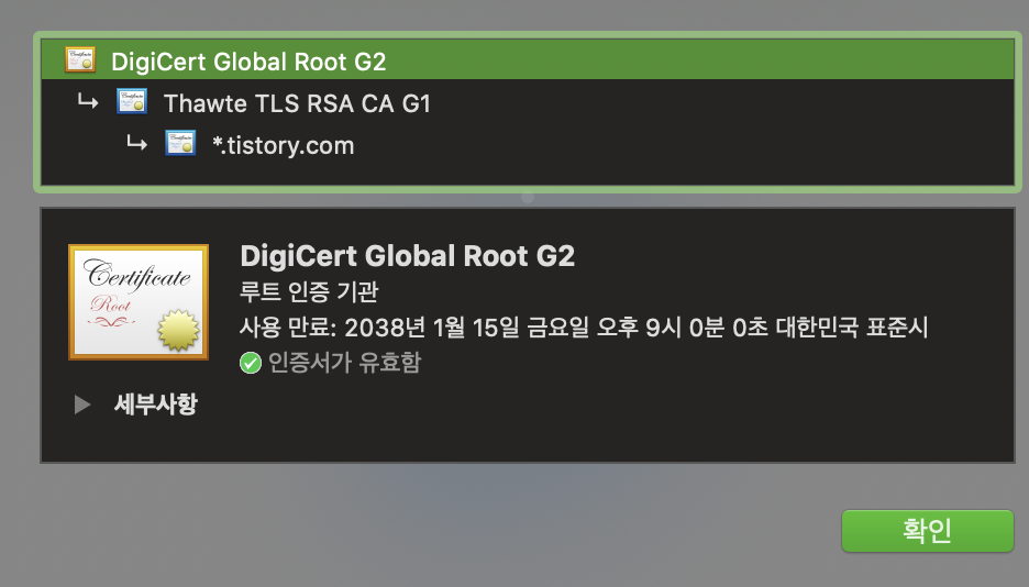 - 해당 인증서가 CA에 의해 발급된 것인지를 확인하기 위해서 클라이언트에 내장된 CA리스트를 확인