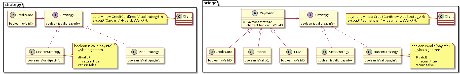 I was thinking the same, but recently I had to use bridge and realized that bridge is using strategy and adding abstraction to the context so that you later can make more changes without changing the client. When using Strategy without the abstraction the design is not as flexible and may require changes to the client later. But when using the whole bridge the design becomes even more flexible. Here you can se how going from Strategy to Bridge gives more flexibility. Also we assume that now "visa" and "master" are not only available on cards but on phones and chips also; and if we use bridge it is much easier to add that support.