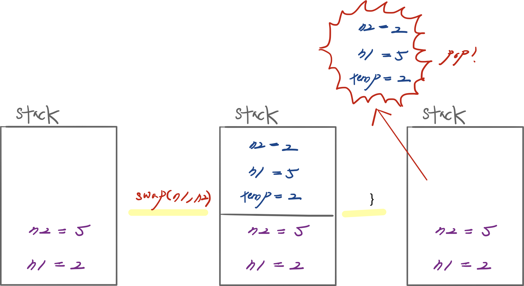 조금 더 구체적으로 말하자면 swap() 함수를 호출하는 시점에는 temp 변수와 n1, n2 가 새롭게 스택에 쌓이게 된다.