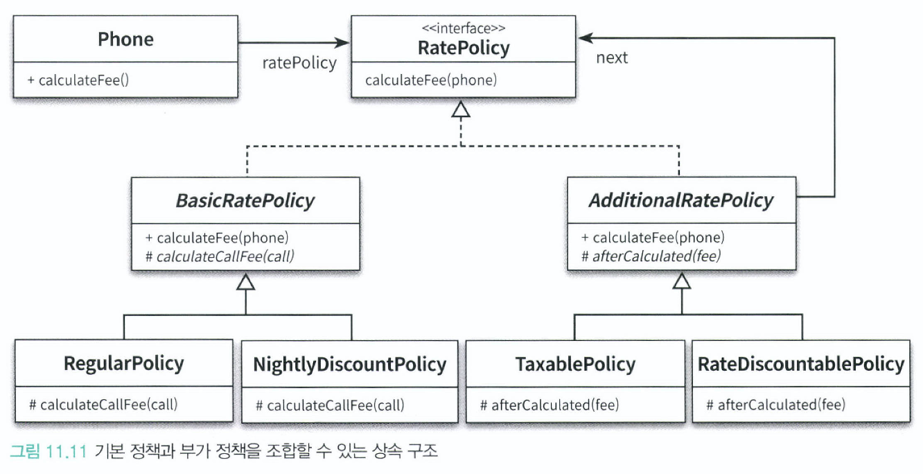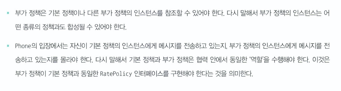 ![]() 컴파일 시점에는 Phone이 RatePolicy 인터페이스와 협력하지만 런타임 시점에는 RegularPolicy와 협력한다. 부가 정책 적용![]()
