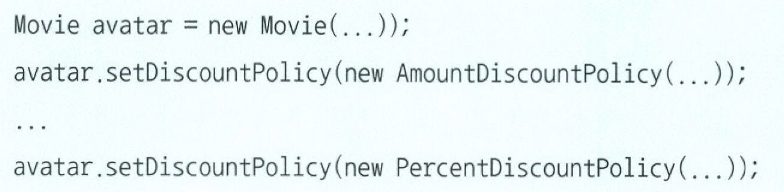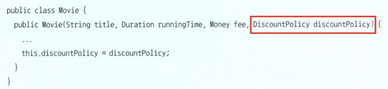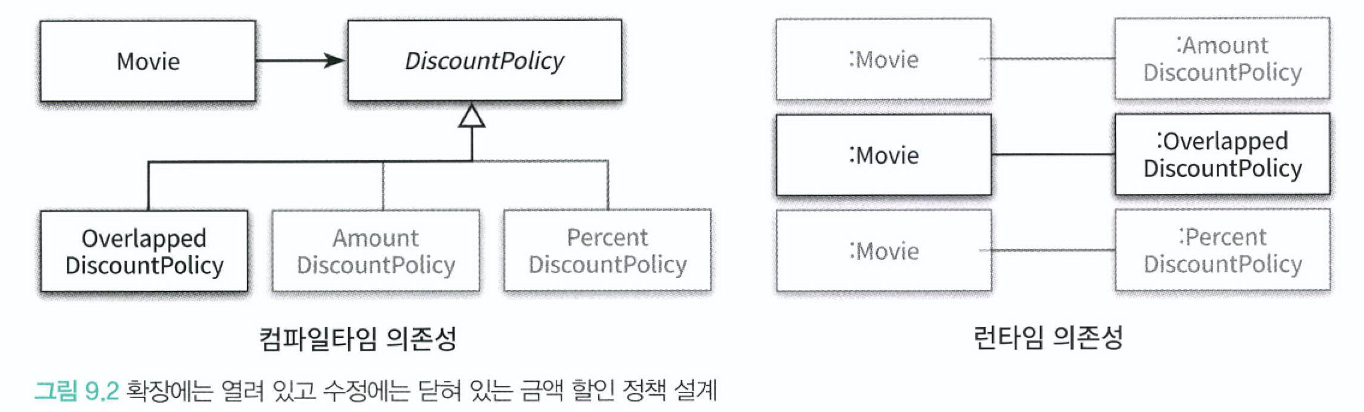 코드 작성 시점의 Movie 클래스는 할인 정책을 구현한 두 클래스에 대해서 알지 못하지만 실행 시점의 Movie 클래스는 두 클래스의 인스턴스와 협력할 수 있게 된다. (컴파일 시점의 의존성과 런타임 시점의 의존성이 다르다.)