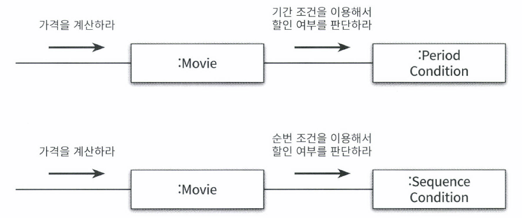 ![]() 할인 가능한지 여부를 판단할 수 있는 객체는 누구인가? 할인조건 ![]() 할인 조건은 자체적으로 할인 여부를 판단하는 데 필요한 모든 정보를 알고 있기 때문에 외부의 도움 없이도 스스로 판단 가능! |