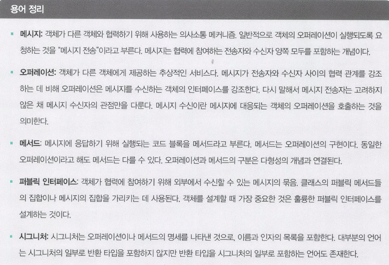 퍼블릭 인터페이스란 객체가 의사소통을 위해 외부에 공개하는 메시지의 집합을 말한다.