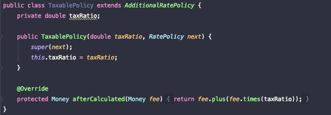1. 부가 정책에 관한 추상 클래스인 AdditionalPolicy 생성 ![]() 2. 세금정책 구현 (기본요금 할인 정책도 추가하는 것도 이와 동일) ![]() ![]() 상속과 합성 최종적으로 비교해보기상속 ![]() 합성 ![]() 상속에서 기본정책을 추가할 때에는 5개의 클래스를 추가했던 것을 기억하는가? 이와 다르게 합성을 사용하였을 때는 클래스만 추가하면 된다. ![]() |