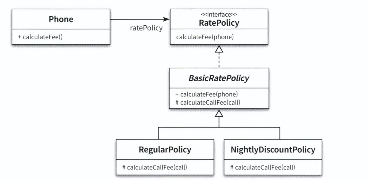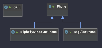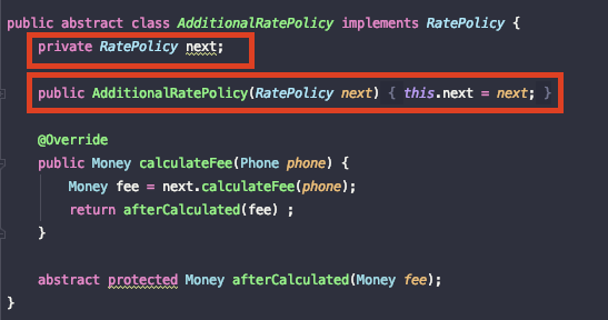 1. RatePolicy 인터페이스 (기본정책 + 부가 정책) ![]() 2. 중복 코드를 담기 위한 BasicRatePolicy 추상 클래스 생성 ![]() 3. BasicRatePolicy를 구현한 일반 요금제 클래스 생성 (또 하나의 기본정책인 심야 요금제도 비슷한 방식으로 생성) ![]() 4. Phone 수정 (인터페이스 -> 클래스) ![]()