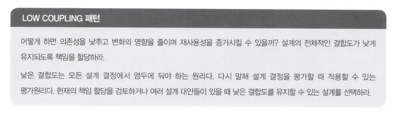 LOW COUPLING(낮은 결합도) HIGH COHESION(높은 응집도) 패턴몇 가지 설계 중 한 가지를 선택해야 하는 경우가 빈번