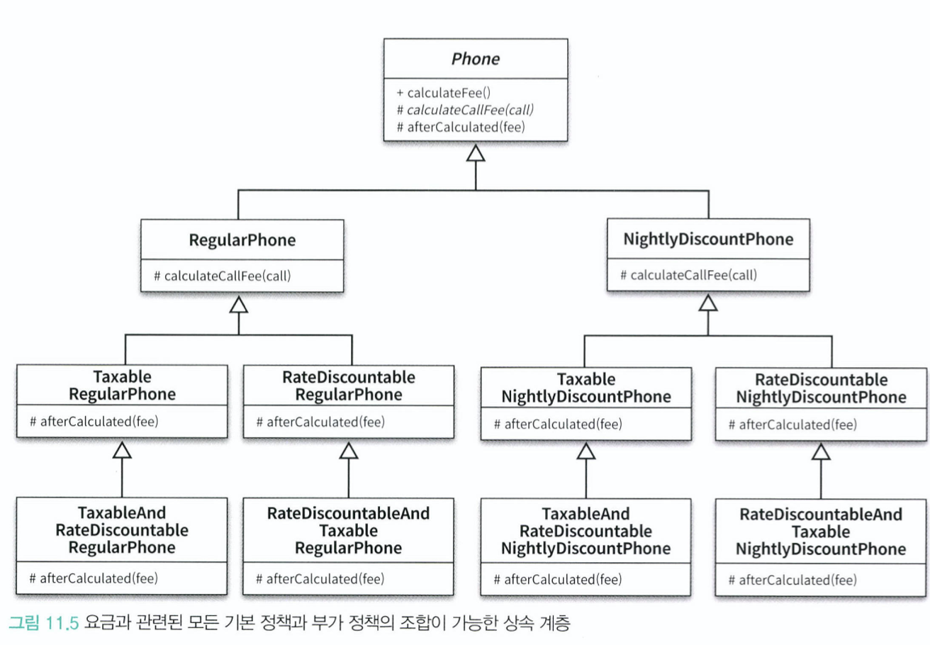 일단 상속을 함으로써 발생하는 일련의 문제점들을 살펴보자 일반 요금제와 세금 정책의 조합을 상속으로 구현가장 쉬운 방법은 일반 요금제를 세금 정책이 상속받는 것이다. ![]() 위의 코드에서 도드라져 보이는 것은 super이다. 즉 자식 클래스가 부모 클래스의 코드를 직접 참조한다는 것이다. 이로 인해서 부모 자식 간의 결합도가 높아져 버리는 문제점이 생긴다. ![]() ![]()