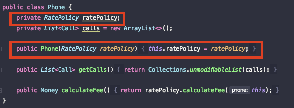 1. RatePolicy 인터페이스 (기본정책 + 부가 정책) ![]() 2. 중복 코드를 담기 위한 BasicRatePolicy 추상 클래스 생성 ![]() 3. BasicRatePolicy를 구현한 일반 요금제 클래스 생성 (또 하나의 기본정책인 심야 요금제도 비슷한 방식으로 생성) ![]() 4. Phone 수정 (인터페이스 -> 클래스) ![]()