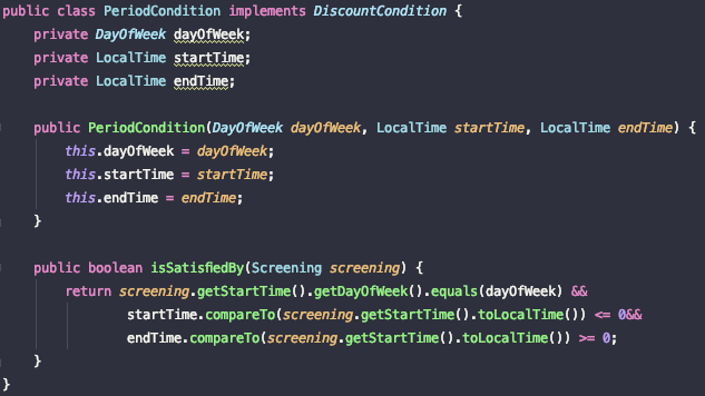 PeriodCondition 클래스의 의존성 ![]() 2. 의존성 전이Screening이 가지고 있는 의존성 : Movie, LocalDateTime, Customer PeriodCondition이 가지고 있는 의존성 : DayOfWeek, LocalTime, Screening
