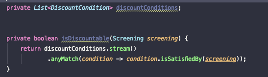![]() 개선 1. 목록을 따로 유지![]() 이러한 방식으로 구현하면 부작용은 만약 할인조건이 추가된다면 List 도 추가하고 해당 조건을 판단하는 메서드도 추가하는 작업이 나타난다. 또한 해당 메서드를 호출하도록 isDiscountable 메서드를 수정해야 한다.