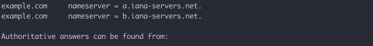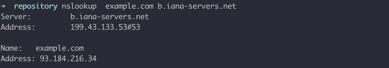 명령어 : nslookup example.com b.iana-servers.net.