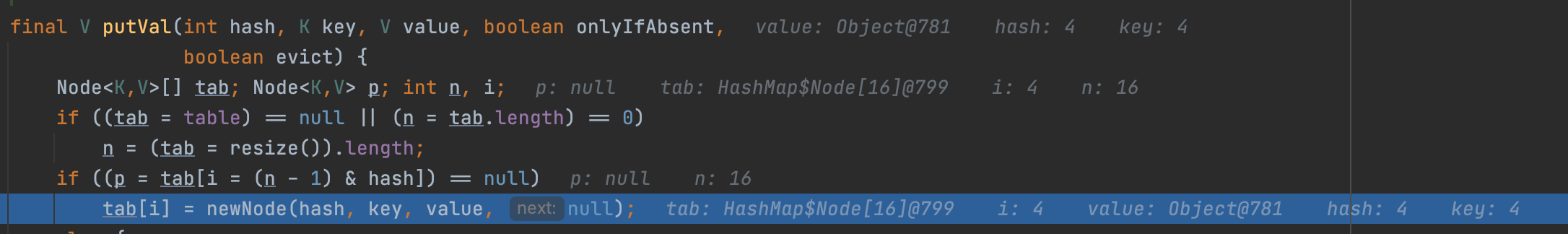 p.next = newNode(hash, key, value, null);