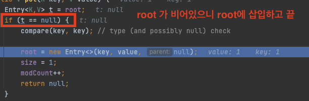 Entry<K,V> t = root; //root는 현재 [1, 1]