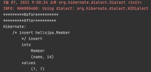 데이터베이스에 저장되는 시점을 알아보기위해서 아래와 같이 영속성 컨텍스트를 설장하는 전 후 시점에 sout을 찍어보도록하자!