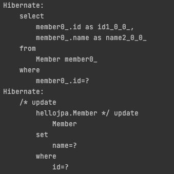 - 변경을 감지하였다면 UPDATE 쿼리를 쓰기 지연 SQL 저장소에 생성을 하고 데이터베이스에 반영하고 커밋을 진행한다.