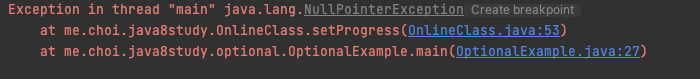 만약 이렇게 파라미터에 null을 직접적으로 넣어주는 경우엔 NPE가 발생하게 된다. (Optional을 쓴 의미가 없음)