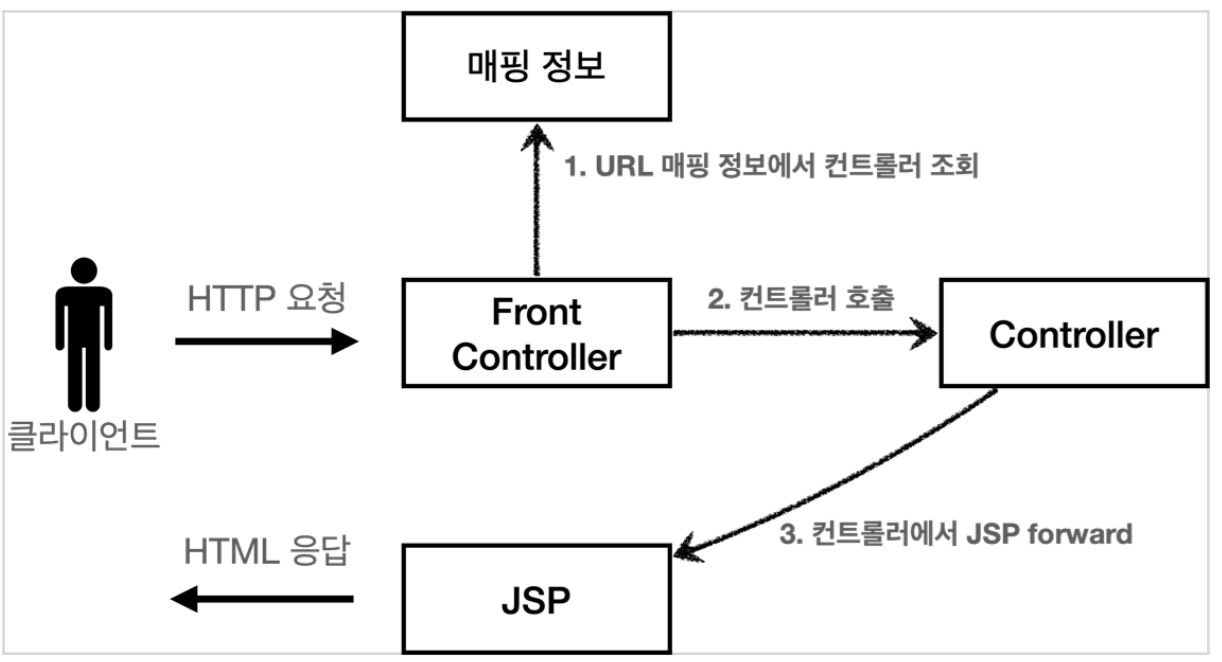 FrontController에서 HTTP 요청을 받고 매핑 정보를 확인한 다음 매핑 정보에 맞는 컨트롤러를 호출하여