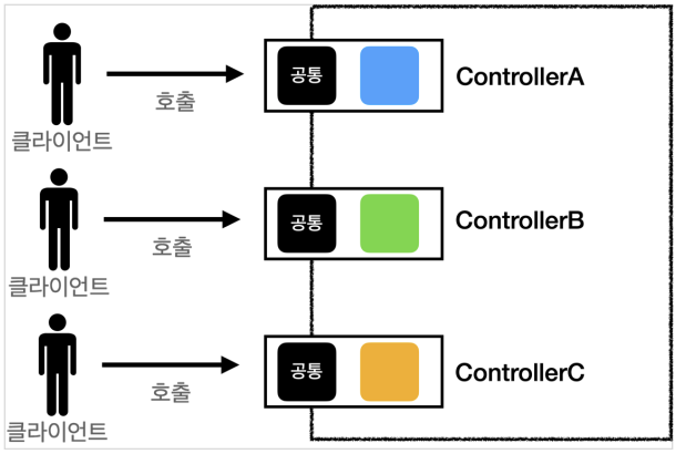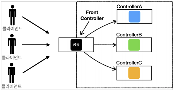 FrontController 패턴도 마찬가지다 여러 클라이언트들의 요청이 있고 해당하는 요청마다 컨트롤러가 있다고 가정하자!
