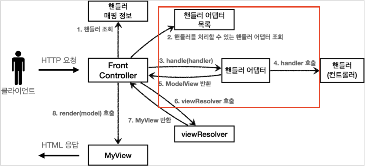 컨트롤러에 매핑할 핸들러 정보를 찾아서 어댑터를 통해서 컨트롤러(핸들러)에 접근한다.