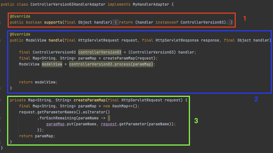기존 Version03, Version04에서는 컨트롤러에 위임하는 처리를 FrontController에서 수행하였지만 이제 해당 과정을 Adapter에서 처리한다.