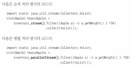 이처럼 자바8의 스트림 API는 한번에 처리하던 기존방식을 탈히여 병렬로 처리하게끔 도와준다.(스레드 사용X)