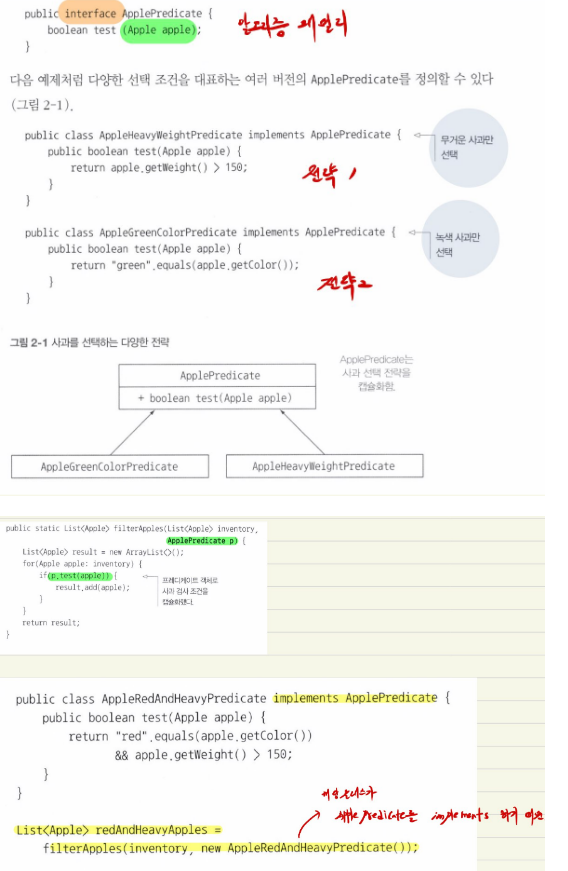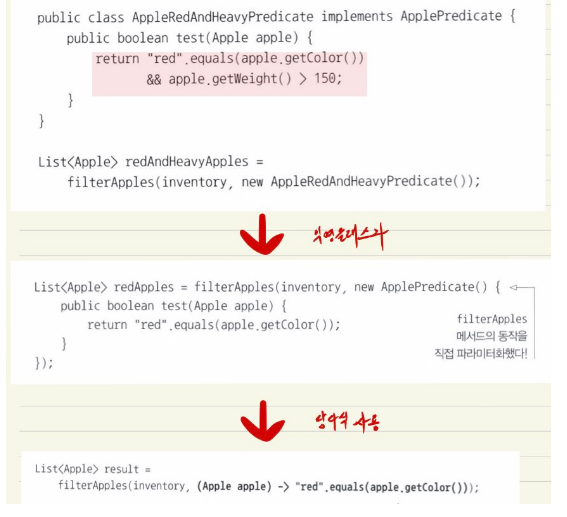 결론 : Applepredicate를 상속받는 특정 객체를 filterApples 에 전달하면서