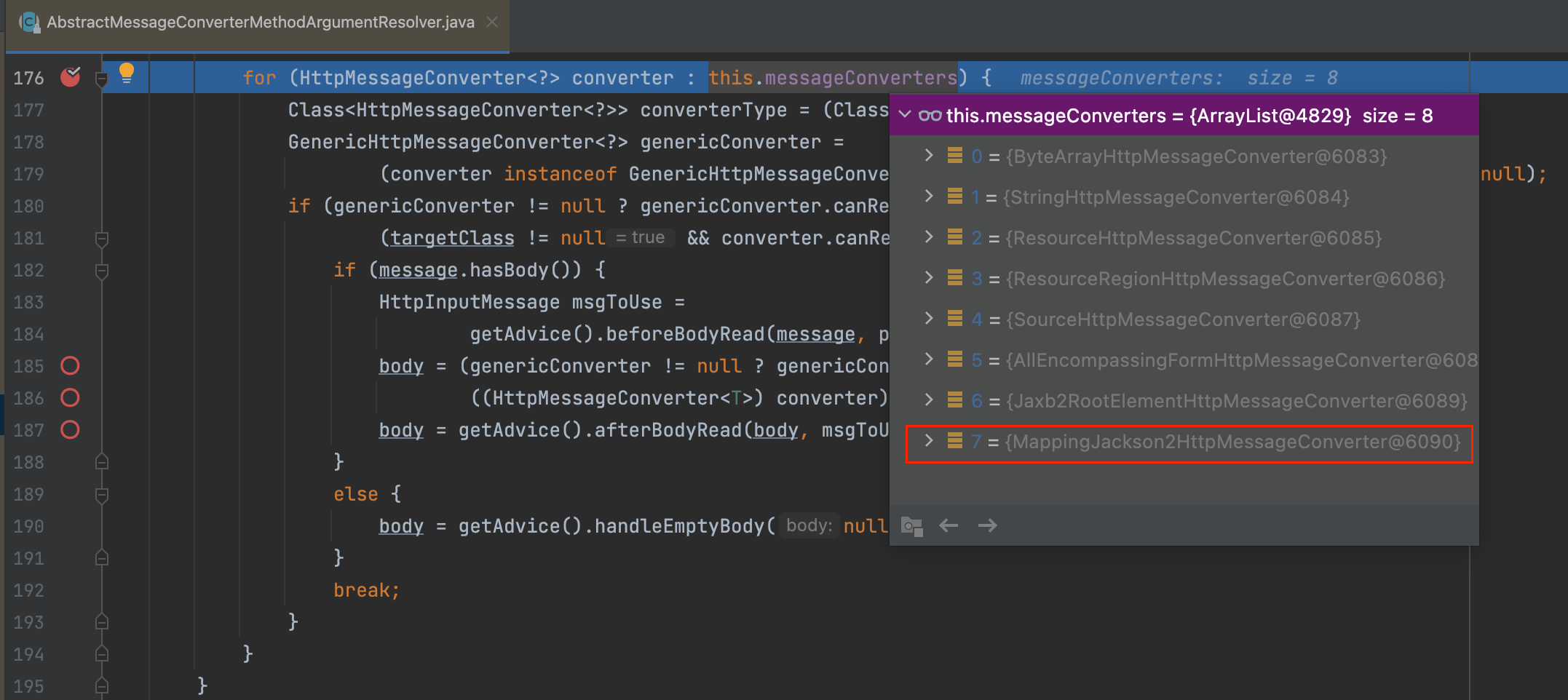 8가지의 messageConverter를 순회한 다음 요청한 contentType과 파라미터를 읽을 수 있는 messageConverter를 찾는다.