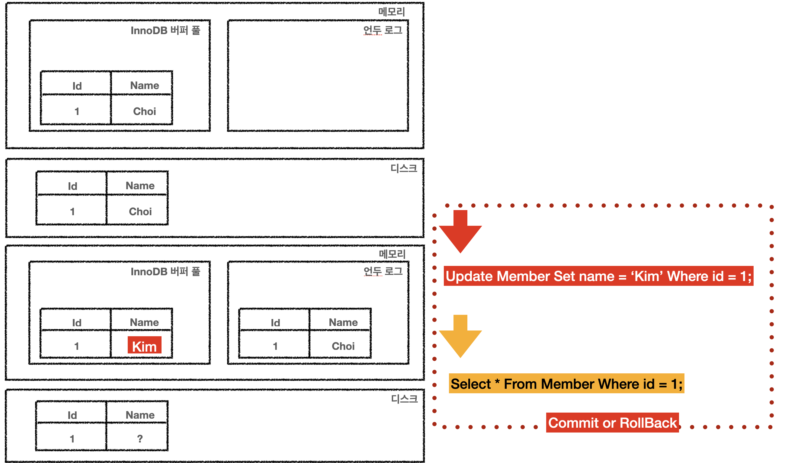 - 트랜잭션이 롤백되는 경우에는 언두 로그에 적재된 데이터를 다시 버퍼 풀로 복구하고 언두에 있는 데이터를 삭제 처리한다.