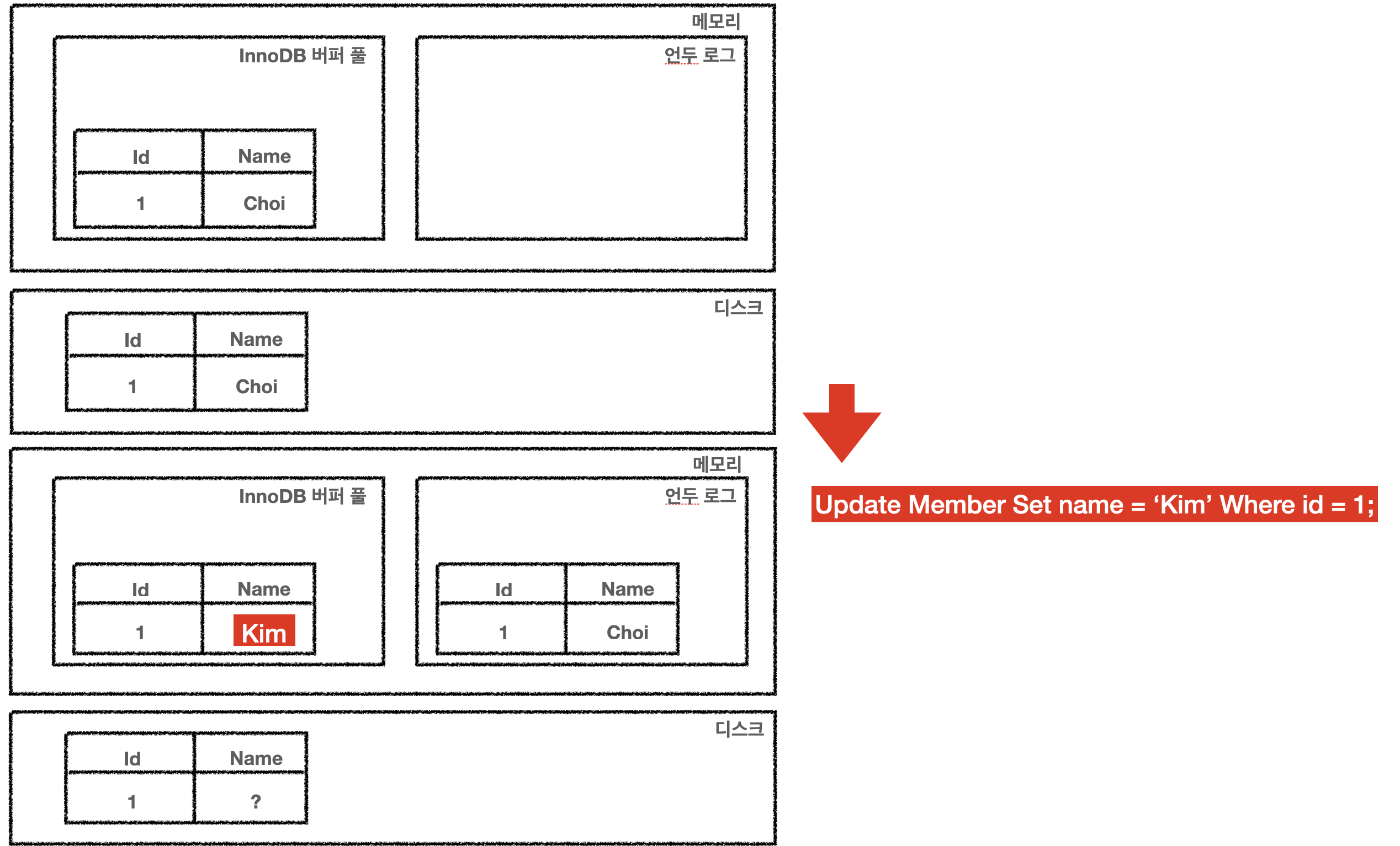 - 최초 Insert 시점에는 버퍼 풀과 디스크에 데이터 적재