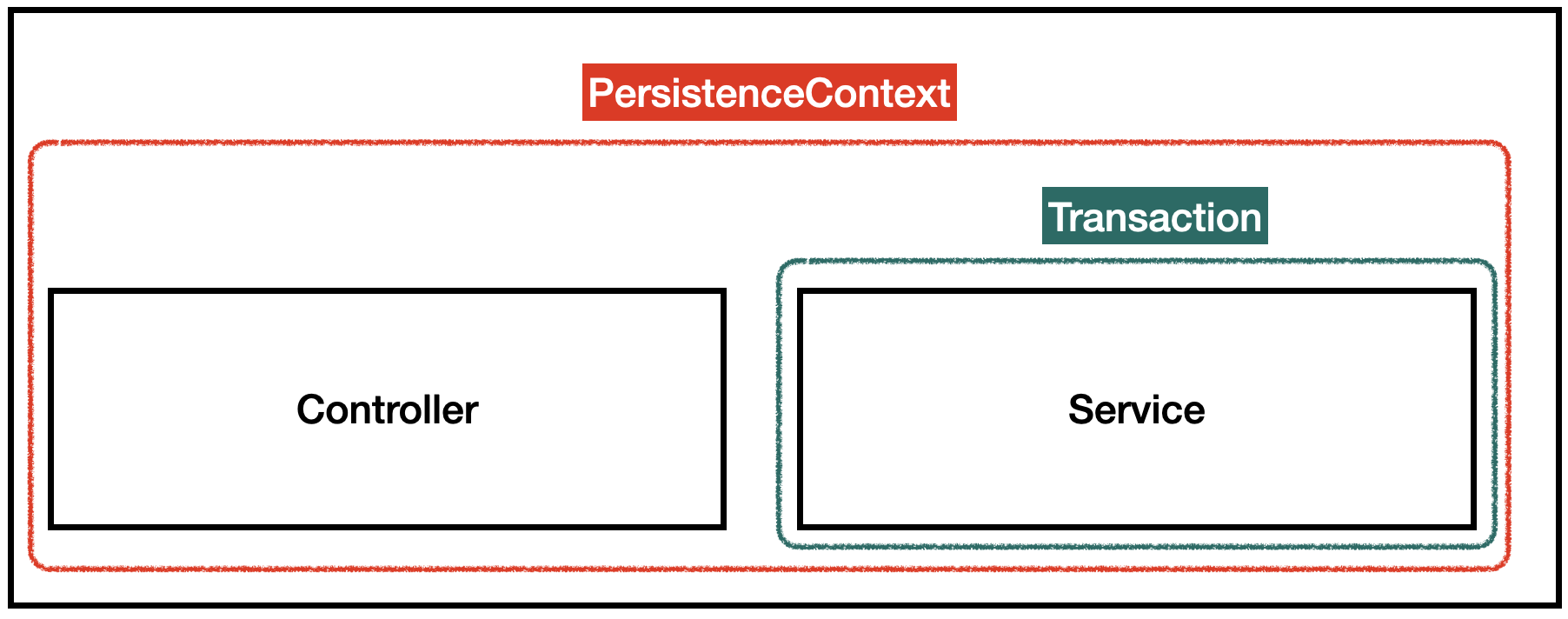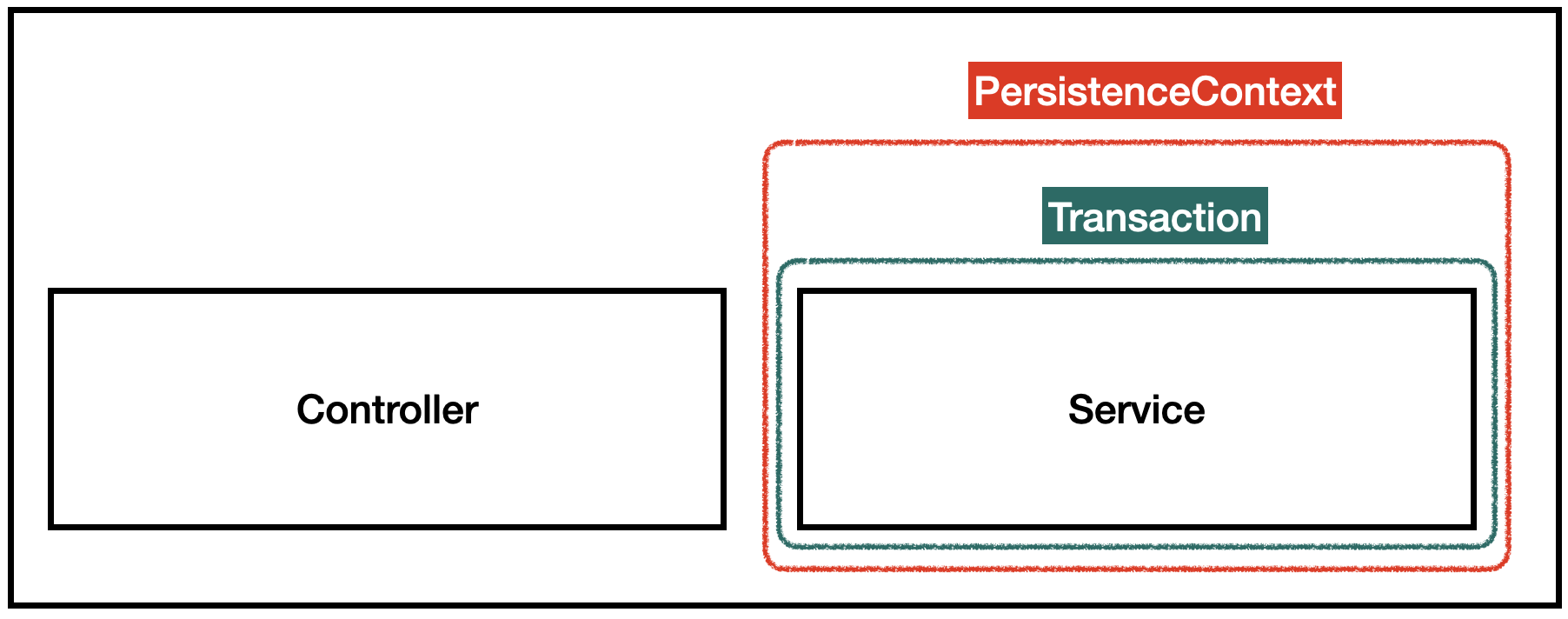 그렇기 때문에 다음 레이어 까지 트랜잭션이 이어지지 않으면 영속성 컨텍스트가 종료되어