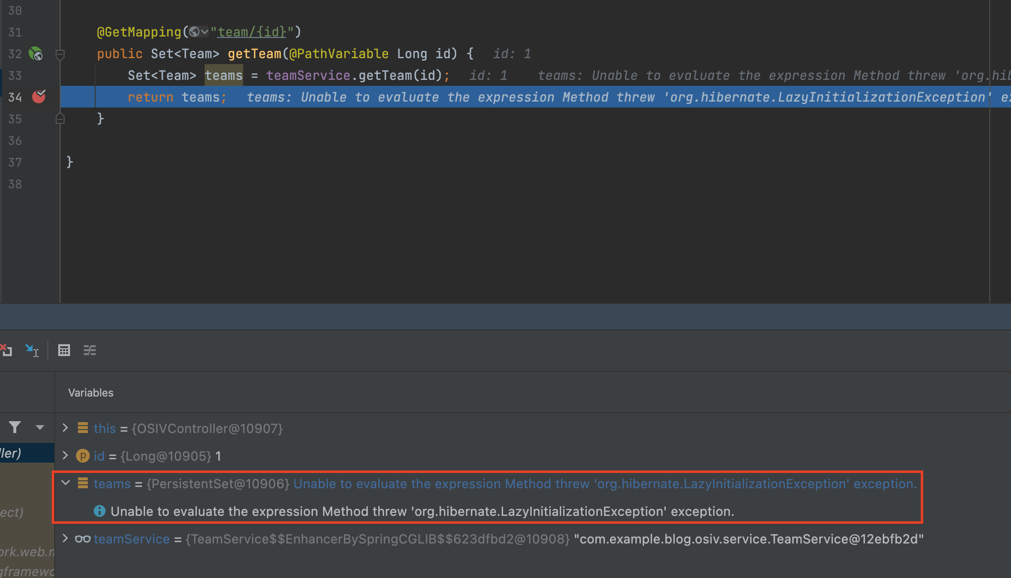 그렇기 때문에 Service 레이어에서 리턴 받은 값을 Controller에서 조회하는 과정에서 영속성 컨텍스트가 끊겼기 때문에 값을 가져올 수 없어 오류가 발생하는 것이다.