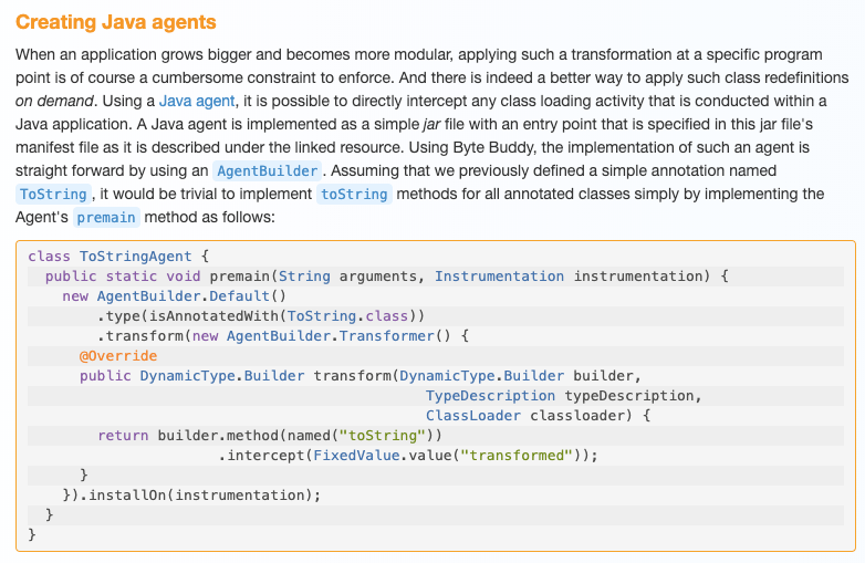 그리고 그러한 클래스를 재정의할 때 적용 할 수있는 더 좋은 방법이 있습니다 . Javaagent 사용하면 Java 응용 프로그램 내에서 수행되는 모든 클래스 로딩 활동을 직접 가로 챌 수 있습니다. Java 에이전트는 링크 된 자원에 설명 된대로이 jar 파일의 Manifest 파일에 지정된 시작점이 있는 단순 jar 파일로 구현됩니다 . 바이트 버디를 사용하면 이러한 에이전트의 구현을 간단하게 사용할 수 있습니다.