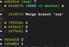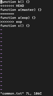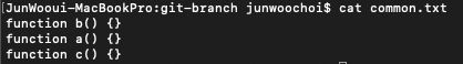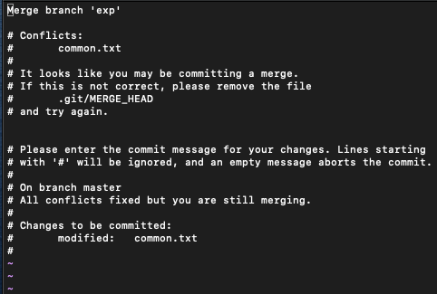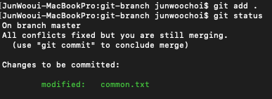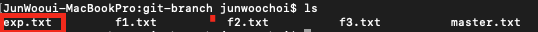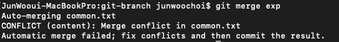 - master branch로 돌아와서 exp branch와 merge 하여 master branch에도 똑같은 common.txt 파일 생성