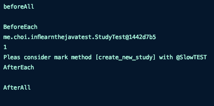 - 실행이 오래걸리는데 @SlowTest 가 붙어있지 않다면 붙이라고 권장하는 메세지