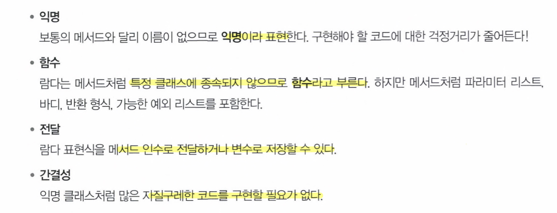- 람다 표현식으로 추상 메서드 구현을 직접 전달 가능 -> 전체 표현식을 함수형 인터페이스의 인스턴스로 취급
