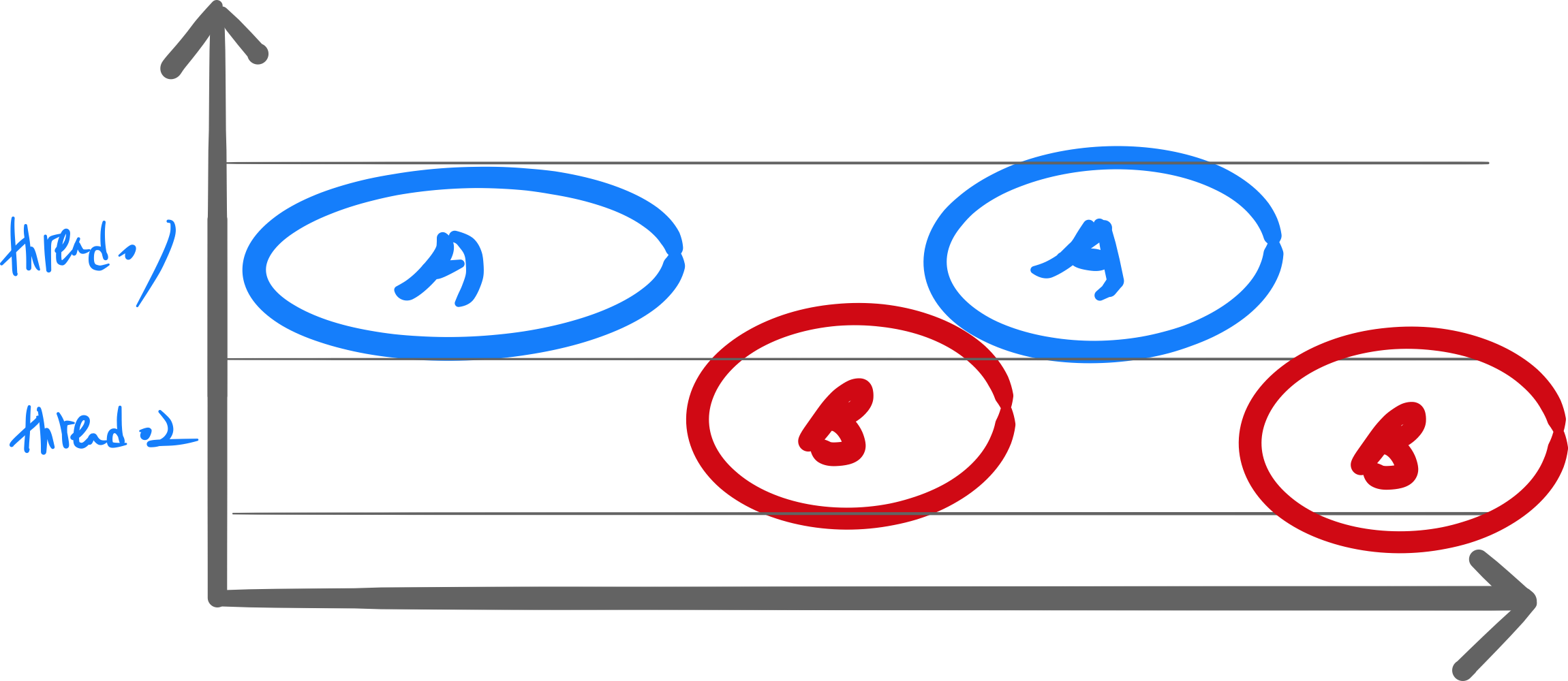 - 멀티 코어로 실행하였을 경우에는 동시에 두 개의 쓰레드를 처리하므로 겹치는 부분이 발생한다.
