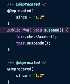 suspend(), stop() 메서드를 살펴보면 suspend의 boolean 값을 true로 초기화하고 interrupt()를 발생시킨다.